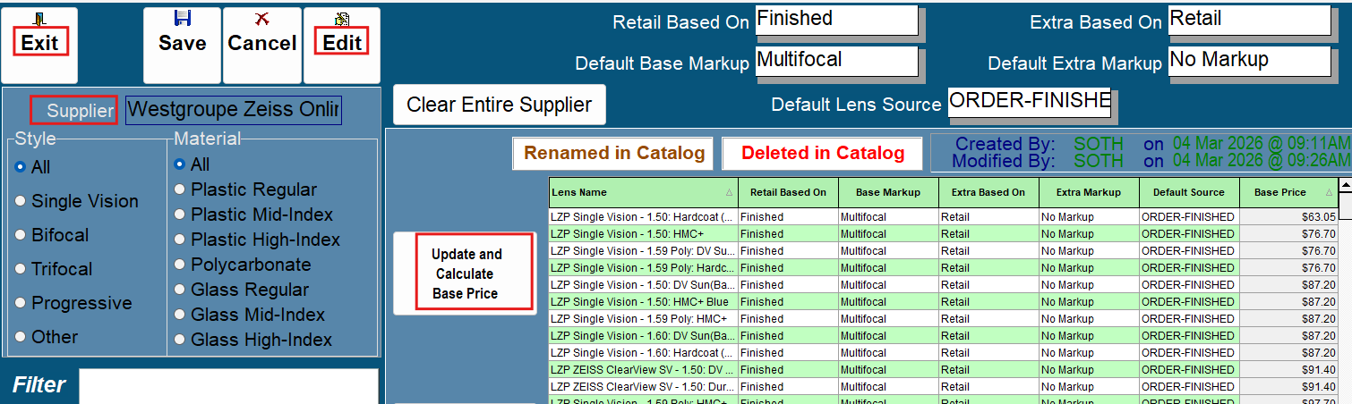 Updating Lens Markup and Recalculating Base Prices