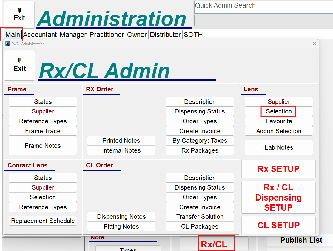 VE Admin > Main > Rx/CL > Lens Selection.